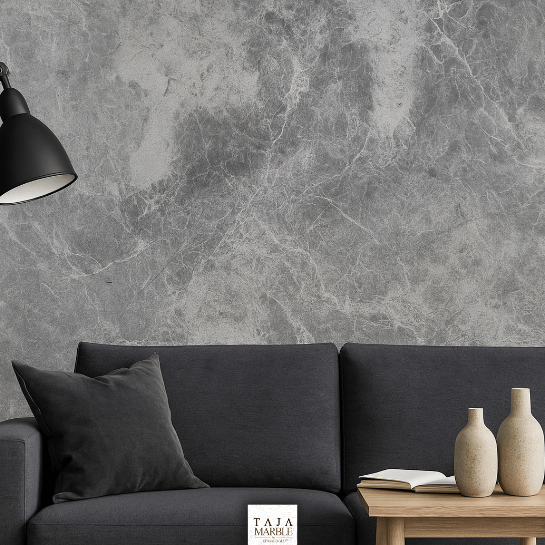 In this image, the fine-veined grey marble surface adds a sophisticated character to modern interiors. The elegant white tones and natural texture offer a timeless elegance in living rooms, bathrooms, or office spaces.